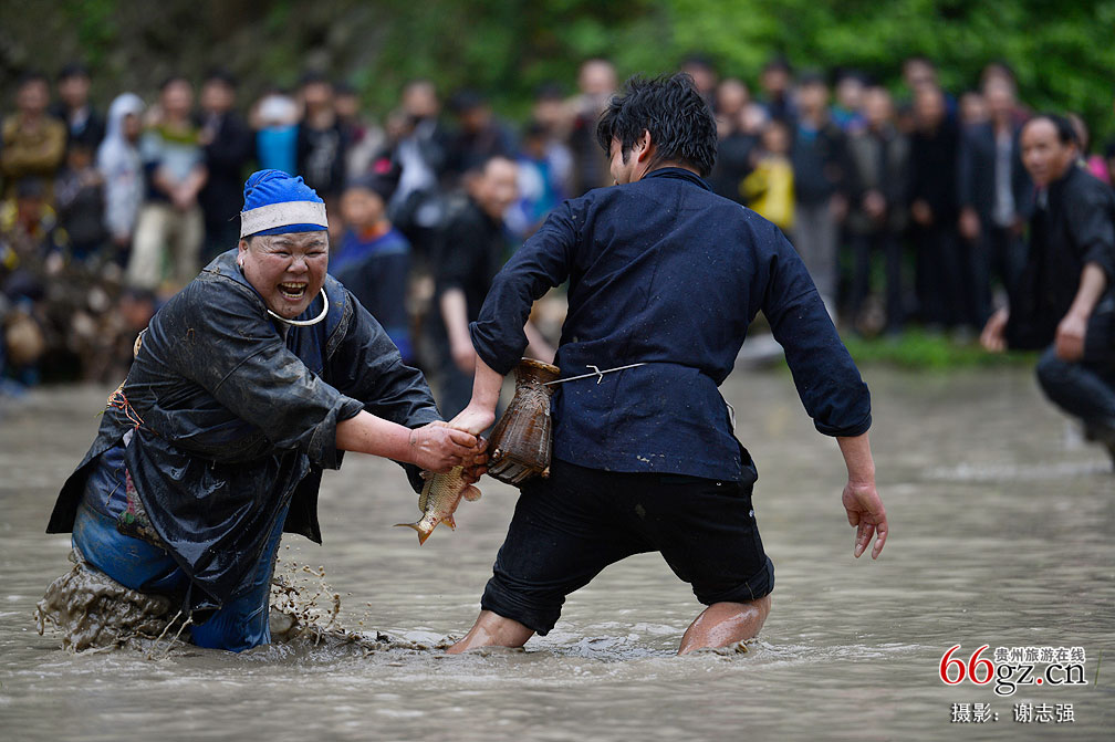 “稻田捉鱼”是贵州省剑河县苗族村寨过“三月三”时进行的一项娱乐活动。村民们在水田里进行徒手捉鱼,在规定时间内捉到鱼的村民则免费获得该战利品,苗族同胞你争我抢,让观看比赛的群众们感受到颇多乐趣。