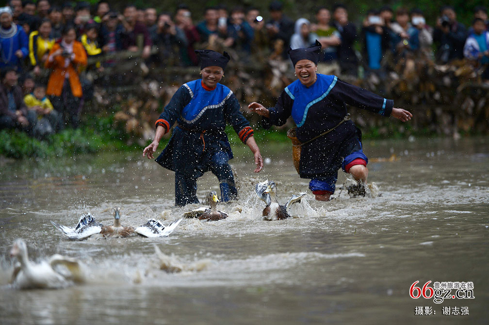 剑河县高雍苗族过“三月三”一直都有抢鸭子的习俗。相传,300多年前,清军屠杀苗民平息后,村民们再次团聚,家园已不在,将面临重建。为了选出头领带领大家重建家园,于是用了“抢鸭”的活动推举出了一位名叫报耶柱的年轻人,在他的带领下,高雍很快发展起来。从此,抢鸭子便成为高雍苗族同胞选举头领的方式沿袭了下来,之后演变成村民的一种娱乐活动传承至今。