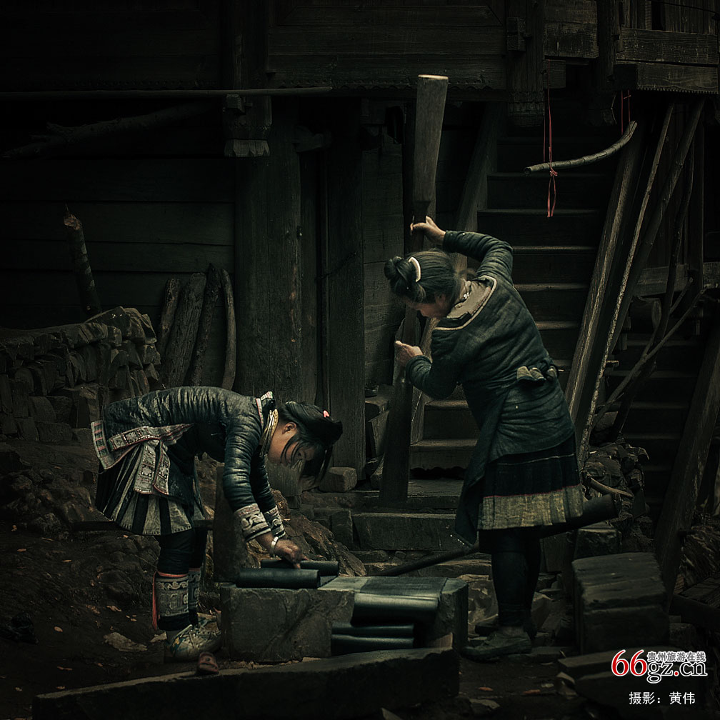 在大歹苗寨闲逛,老远就听见锤布的声音,均匀流畅、悦耳动听。走进一看,貌似是一对母女,他们正在家门口锤亮布,只见妈妈用棒槌捶打锤布石上的亮布,用力均匀;女儿则不时的把捶打过的布块上下翻动。一幅自然又生动的劳作场景。(图片源自:“从江城运杯·神秘从江”国际摄影赛银质收藏奖作品)