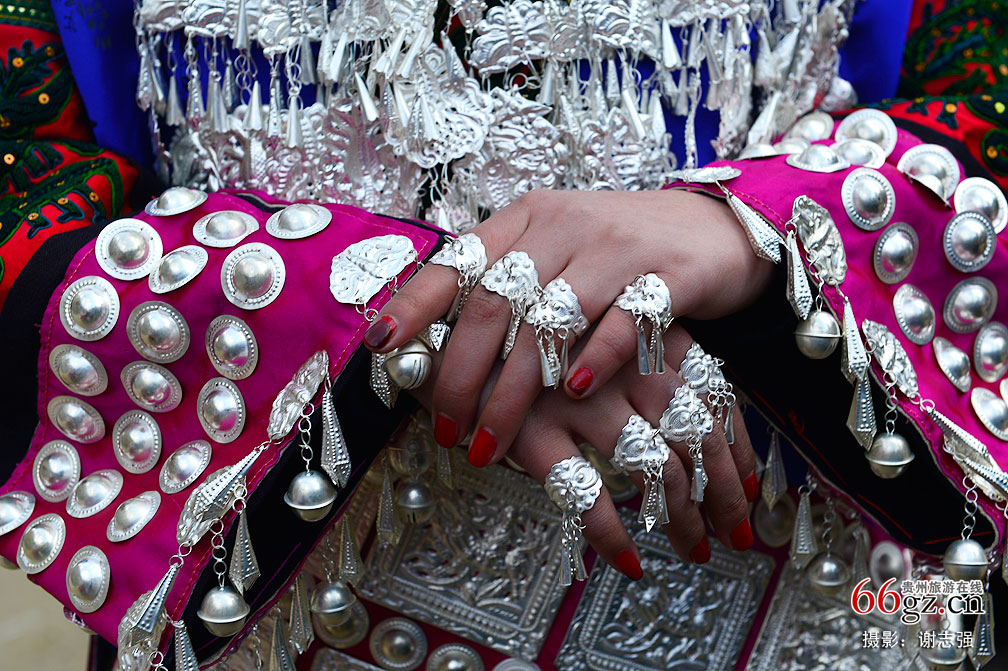 每当节日或婚嫁,苗族姑娘银衣盛装出场,从头至脚前前后后的“全副武装”。其装饰之华丽精美,令人眼花缭乱。近期拍摄了贵州省台江县汪江村的苗族盛装,一个局部就足以说明问题。一般来说,配齐全身银饰,其重量近达20斤。