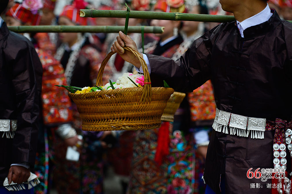 每逢农历三月十五前后,苗寨里都会准备五颜六色的姊妹饭,欢天喜地地过姊妹节。如果有外寨的后生们来作客,会得到姑娘们的热情招待,临别时赠送姊妹饭表达情意。姊妹饭有如无字的情书,撮合了无数美好姻缘。图为台江县城姊妹节万人盛装巡游的队伍中,苗家男子挑着姊妹饭巡游。