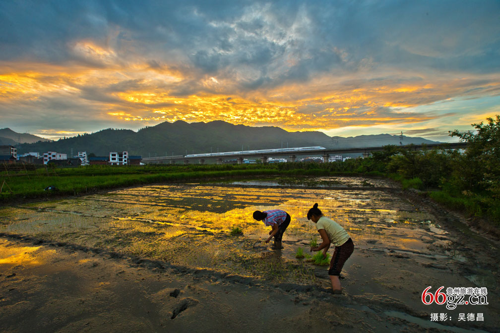 傍晚时分霞映田园,高铁穿越民族村寨,村民田间劳作,一幅和谐生活景象。该幅作品荣获2017年“苗侗祖源 绿色榕江”影像征集活动收藏奖。