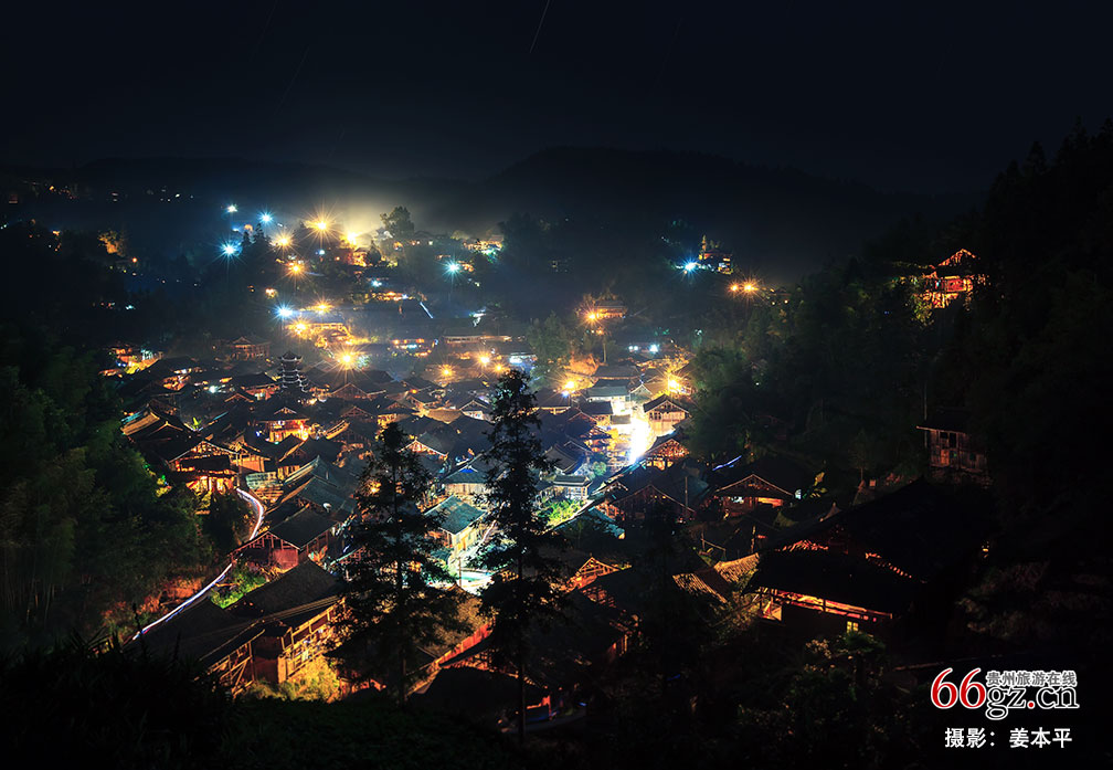 夜晚时分,在星星点点灯光闪烁下,整个侗寨被点缀得古朴宁静。该幅作品荣获2017年“苗侗祖源 绿色榕江”影像征集活动收藏奖。