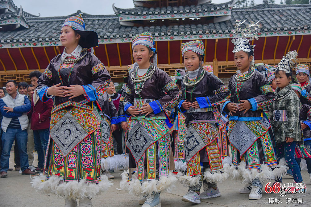 摆贝苗寨苗年节活动,四里八乡亲友欢聚一堂,身着节日盛装,载歌载舞,庆祝当年丰收,祈福来年风调雨顺,五谷丰登。图为跳芦笙舞的女孩。