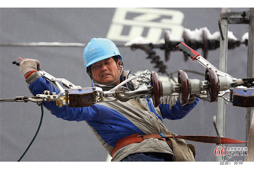 作者在电力工人奋力抢修的时刻按下快门,恶劣天气里站在抢修一线的劳动者形象被淋漓尽致的表现了出来。雨雪纷纷,环境与人物相辅相成,一种紧张抢修的进行时油然而生。(图片源自/“贵在责任 贵在关爱”第二届全国网络摄影大赛相机类三等奖作品,赛事由贵州福贵文化传媒主办、贵州旅游在线网站承办、贵州中烟工业有限责任公司独家支持。)