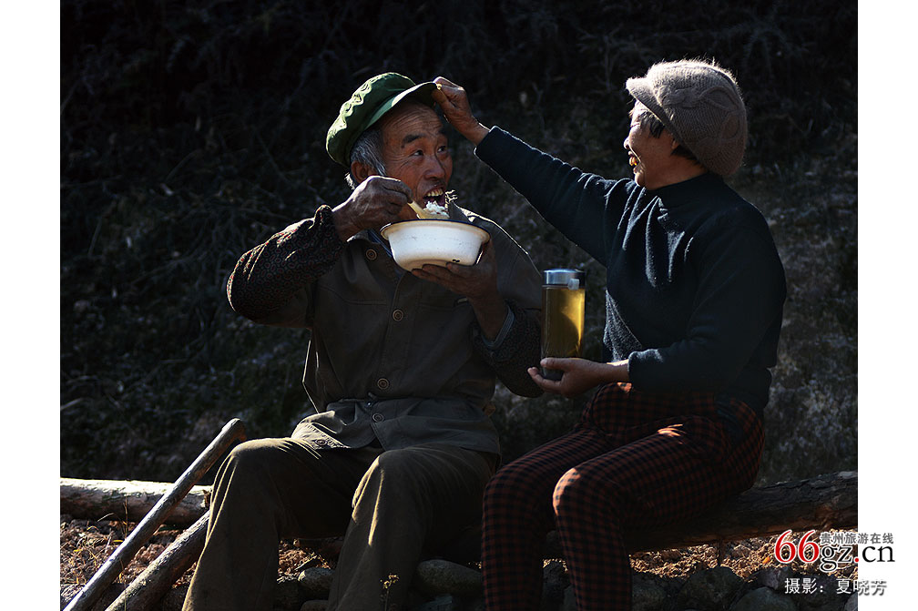 劳动了一上午,妻子把热腾腾的饭菜送到工地上,丈夫一边吃着饭,一边深情地看着妻子,妻子一手端着茶杯,一手很自然地给丈夫整理着帽子,夫妻相对而笑,感情真挚纯朴,神态自然洒脱,叫人陡生羡慕。(图片源自/“贵在责任 贵在关爱”第二届全国网络摄影大赛相机类三等奖作品,赛事由贵州福贵文化传媒主办、贵州旅游在线网站承办、贵州中烟工业有限责任公司独家支持。)