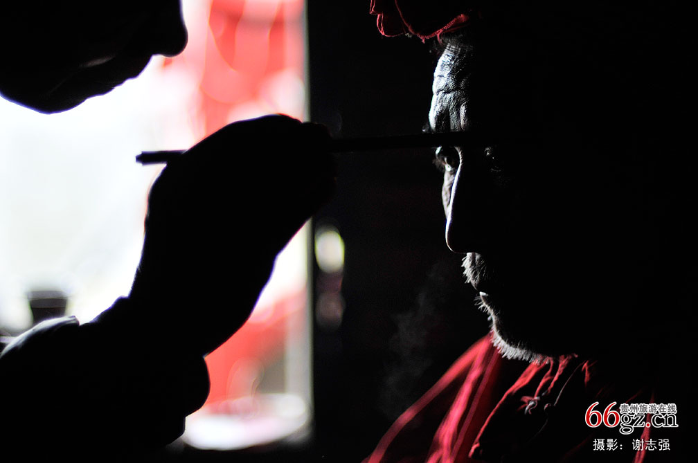 福泉市龙昌镇长冲村天生桥灯夹戏属花灯的一种,有100多年的历史。村里70多岁的村民魏清才等一帮老者们还在传承和延续着,他们用简单的道具和服装表演着传统的戏,虽然现在村里看灯夹戏的人在逐渐的减少,但他们还是坚持着他们的表演。待脸上的油彩绘制完成,又到了该上场的时间了。