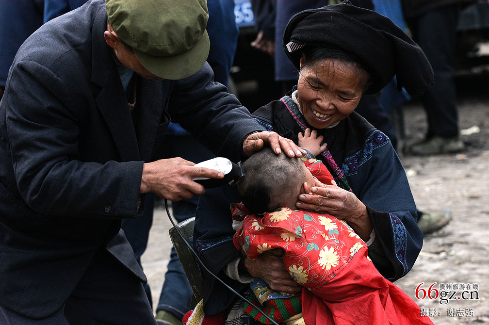 贵州的少数民族村寨一般都没有理发店,要理发只有等到赶集天人们才会去流动理发摊上修剪。这是在三都县都柳江边的一个集市,妇女抱着孙子来赶集,剃头匠为小孩剃头,为了防止孩子哭闹,妇女则不停的在安慰和逗笑。