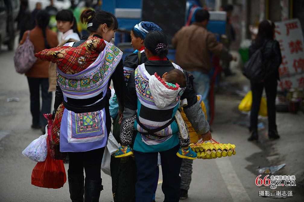 每个星期贵定县都有一个约定俗成的赶场天,在集市上可以看到琳琅满目的山货、具有地方特色的土产,渊源流长的传统小吃和农民喜悦的笑脸。临近中午,多数村民卖完东西后买了其他生活用品便陆陆续续回家。路上几位苗族妇女背着孩子聊着天,提着买到的东西正准备归家。