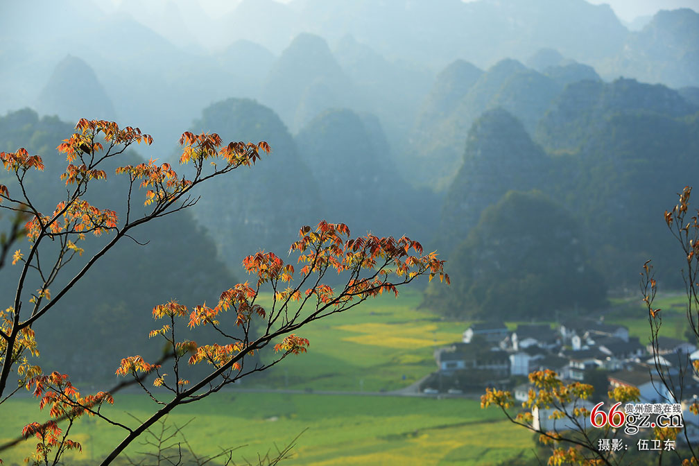 贵州季节的更迭从田野里的油菜花开始。由远及近,由近及远,奔腾着金色波浪,风在花朵里不停地传递着春的信息。顿时,峰林间花香关不住。春天便稳稳当当地坐在万座峰林之上。几缕明媚阳光,几片彩色花瓣,几声欢快鸟语。阳光下的万峰林,虚幻又真实。这就是三月的万峰林,梦境与现实的美妙组合。