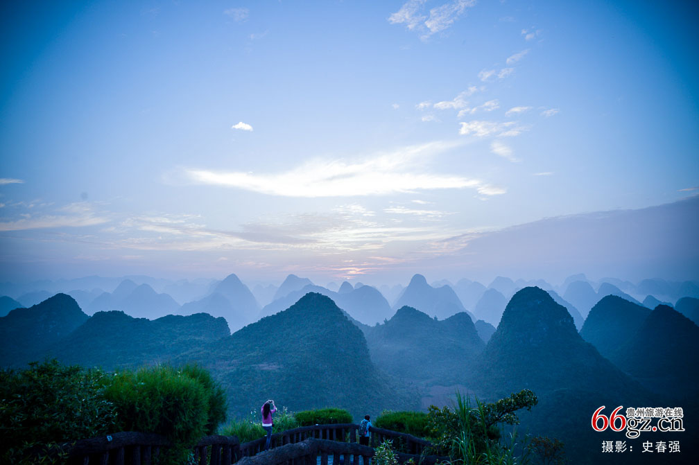 万峰林的山河与村庄完美的组合让人晕眩,对摄影人来说无疑是天堂。晨起登高远望,东峰林青灰色的秀峰似林,黄绿相间的田野成片,村庄坐落其中,一幅绝美的日出景象呈现眼前。