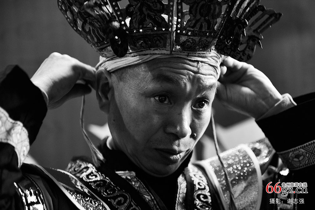 为期两天的“大美德江”非遗文化周末聚活动在贵阳市展开。傩绝技--开红山表演成为此次活动最大亮点,只见傩法师开坛请神前,正在后台认真的穿戴做法事时需要的衣帽,神情专注严肃。