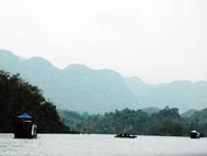 船在前行,美景在不断出现,视野越来越宽,山越来越好看,也越来越青翠,线条轮廓更为柔和与优美。白花花的湖面,游船往来,由于位置的变换,大小的自然搭配,快与慢的相对位移,好像是在有意做一种航行表演,这是一种动态的美与色彩美的有机统一。在这空灵的世界里,一幅幅美景,汇成山水诗的巨流,流向我的心田,让我得到了一种放松,一种愉悦,一次灵魂的净化,一次情操的陶冶,于我,也许就是黄龙湖的魅力所在。