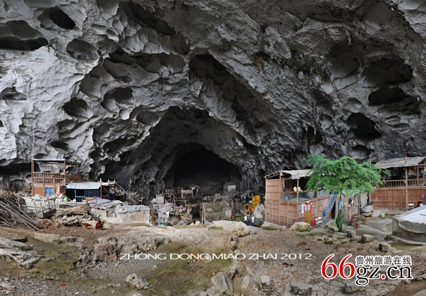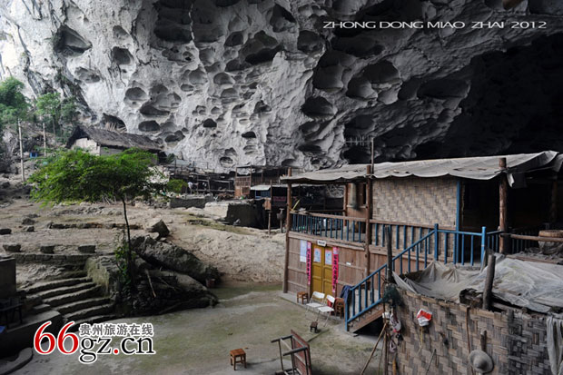 穴居,在贵州许多茫茫大山之中都有存在,但最有名的当属紫云县水塘镇的中洞苗寨。离格凸河不远的大山上,致上而下的分布着三个山洞,其中的中洞是最大的一个,这个100多米宽、200多米深的洞穴里,现住着18户人家共70多个苗族人,他们的祖辈当年或许是为躲避战乱而迁到山里,最先穴居于略小一点的下洞,解放后才逐步迁往现在的中洞,但没有一个人说得清楚是何时开始在此穴居的。