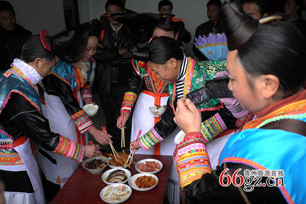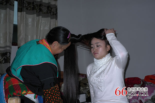 第二天,是新娘出嫁的日子。早上9点,我们一行便赶到新娘家,真巧,新娘正在换装打扮,一位中年妇女(也许是新娘的嫂嫂)正在给新娘梳理头饰。古董苗族妇女的头饰也是很特别的,绑头发的是一把一尺来长的带尖的梳子,梳齿在头发根部固定以后,再将头发梳理成弧状,挂到梳子的中部,然后再将发梢固定于梳子尖部,整个头饰做下来大概要花一小时左右。接着是换新娘妆,坎肩及上装为高级缎面,边沿全部用花边滚边,裙子为白底间黑色斜条纹,腰带为橙红色,整套嫁衣用色大胆,色彩鲜亮,简洁明快但不乏雍容华贵。
