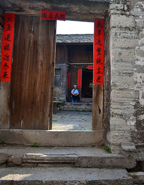 第一次到安顺云峰八寨是盛夏的午后,正午阳光下的屯堡在知了声的映衬下分外静谧。正午阳光直直的打下来,庭院寂寥,疏影离离。树荫里,小狗正在舒服的打着呼;几位穿着屯堡衣饰老人家坐在门前的暗影里,纳鞋底,不时闲聊几句。没有打扰到这石头城堡,自己也寻了个阴凉的角落坐下,听风掠过树梢的声响。