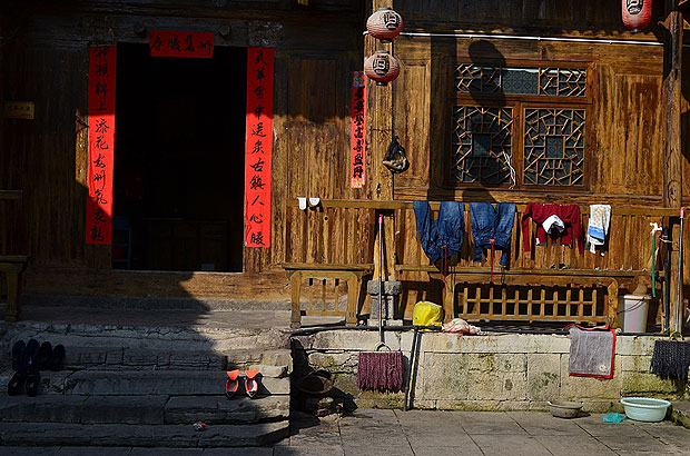 本寨的房屋是安顺(屯堡)传统建筑的代表,建材多用石头,墙是石头砌的,屋顶式石板垒的,灰白的石头在阳光照耀下带着别样的光,望久了,有一点点眩晕,这时候有风吹过,某个瞬间,仿佛踏入久远之前的时空:房舍是古拙的、其间的人衣饰是华贵精致的、言语有些陌生、山风静谧、耀眼的正午阳光也有了一层幽幽的深邃,一切刚好。那种“山中方一日,世上已千年”的恍惚来的真真切切。