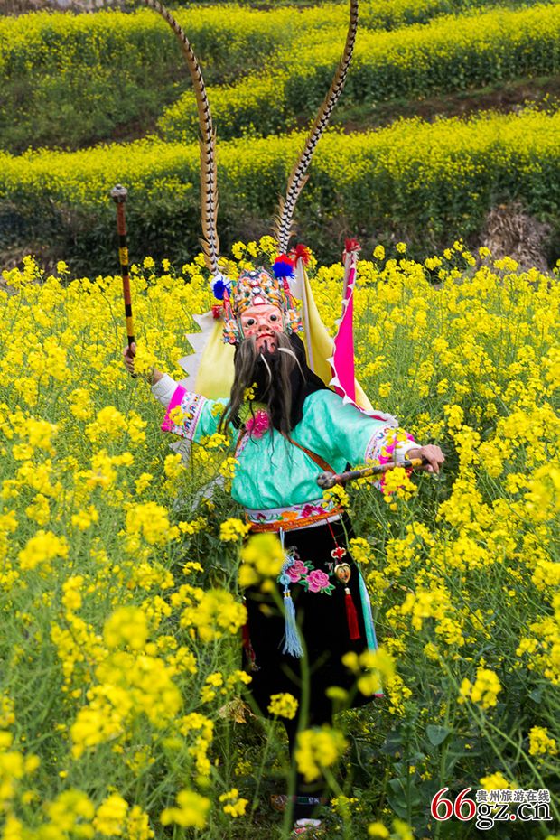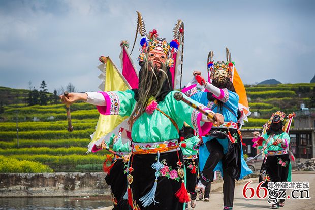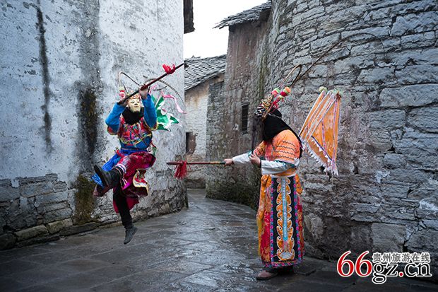 地戏是屯堡人独有的一种头戴木刻假面的民间戏剧,其由来与屯堡人的生存选择有关。据《续修安顺府志》记载:"当草莱开辟之后,人民习于安逸,积之既久,武事渐废,太平岂能长保?识者忧之,于是乃有跳神戏之举。借以演习武事,不使生疏,含有寓兵于农之深意。"