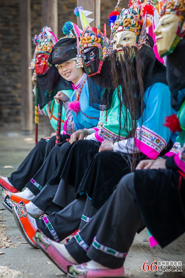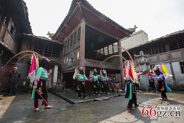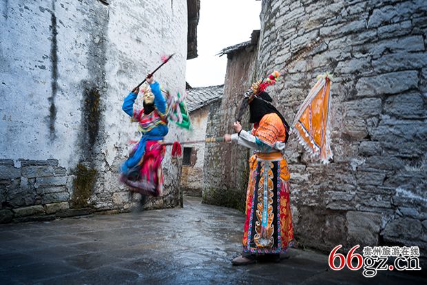 盛行于屯堡村寨,集演戏、祭祀、娱乐于一体的古老戏种。屯堡人依村寨门前或寨中空地为戏台,以憨直拙朴、粗犷自然的露天演唱形式,用唱、念、做、打的艺术手法,表现《封神》、《楚汉相争》、《三国》、《薛刚反唐》、《精忠传》等中国古代忠义历史故事和神话传说。演员们额上戴以简炼夸张的 “ 脸子 ” 即木雕面具,身着长衫,背插小旗,腰系战裙,手持木制短刀长枪,唱着原始的弋阳腔,仅借一锣一鼓的击奏,在一人启口,众人接腔的伴唱下,以人物上下更换时空变换,借三、五步为万水千山,就竹鞭为金戈铁马,依桌椅象征高山要塞,在抑、扬、开、合的厮杀、挡、架、翻、窜的格斗中虚实结合,形神兼备,产生极具击鼓进兵、鸣金收兵的古代战争景象,从而形成屯堡地戏特有的艺术魅力,被称为戏剧史上的 “ 活化石 ” 。曾在法国、西班牙、日本等国演出,引起轰动,登上国际大雅之堂。安顺还有300多个地戏表演团体,是重要的历史文化遗存。