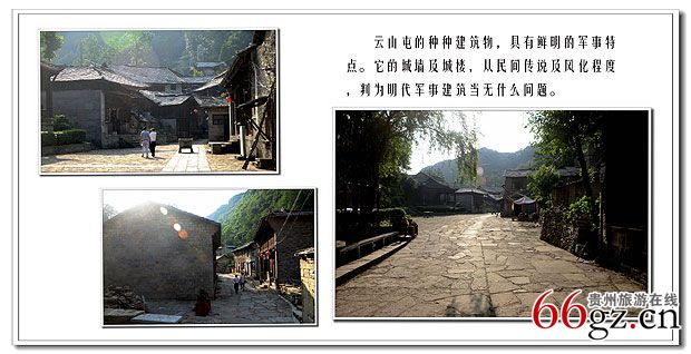 云山屯的种种建筑物,具有鲜明的军事特点。它的城墙及城楼,从民间传说及风化程度,判为明代军事建筑当无什么问题。屯上古堡形“云鹫山寺”的建筑手法与平坝天台山“伍龙寺”如出一辙。亦文亦武、半军半教的天台山伍龙寺建于明万历年间,有修建题记作证。
