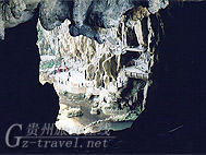 水帘洞出口出有很多石刻,均为古代名人墨客借景抒情有感而发之作。出了石洞,便是半山中的林荫小道了。横跨铁索桥,俯瞰清山绿水,心旷神怡,足下三层阶梯式的瀑布,浪花飞舞;宽阔的湖面,水清如镜,两岸层峦叠翠,相映成一幅天然美景。