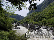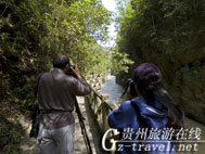 后,船靠岸,开始步行。一路下去,两岸数百米的悬崖峭壁绵沿不断,千奇百怪。姿态万千的石灰岩钙华叠水瀑布一个紧接一个,因是枯水期,有的瀑布已断流,有的虽然还有水,但水量很小,瀑布呈丝状下泻,要是夏天丰水期来这里,这一个一个的瀑布不知有多壮观。大有大的好看,小有小的妩媚,这一丝丝的瀑布从几十米,上百米的悬崖上跌落下来,摔在石头上一掷几瓣,水花四溅,哗哗然,怦怦然,不也让人心生快意么? 过了几座吊索桥,走了一段栈道,那晃悠悠的索桥和颤巍巍的用木板搭成的栈道,上不巴天,下又着地,行走时不能大步流星,也不能慢吞吞似小脚女人,几个小时下来,背上早已湿了几回,真是惊险又刺激,好不容易来到了一处当地人管叫“金钟瀑布”的地方,举目看去,这瀑布真是奇特,像一口金钟,表面呈黄土色,上小下大,中部有一小孔,人可从钟口入,并在内里行走,还可从小孔探出头来。几绺瀑布下挂,如少女秀发,婀娜飘逸。余以为,这应算是南江峡谷的标准像了。这是怎么形成的呢,地质专家认为, 这是喀斯特地貌地形特有的特征——灰华。是在长年流水时形成的,因为水珠中含有石灰质附着于崖壁生长的植物上,数百万年之后形成一层石灰华壳,这层华壳很薄且十分脆弱,一碰即掉。来这里旅游,听专家导游讲解,游人可从中了解到许多知识,特别是一些学生,可以学到许多课堂上学不到的东西。 | |