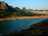 从电站大坝内乘船一路逆行,峡谷高峻,喀斯特岩石临湖一面陡峭呈直立状,如刀削斧劈,山风吹过,呼呼作响,船行不过一里,拐过一道湖湾,但见远处一峰独立,高百丈,曰“笋子山”。
