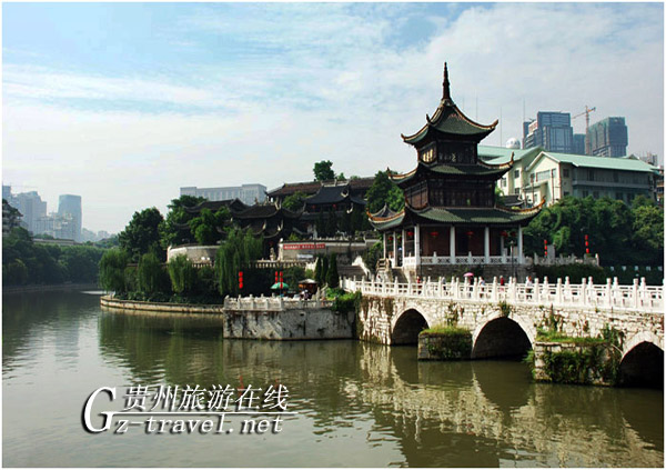 按捺不住对甲秀楼的怀念,我起了个大早,沿南明河往南,到了甲秀楼。 时辰尚早,便在周边闲逛,晨雾里很多老年人在甲秀楼旁的花园小道和广场上打拳、跳舞、抽陀螺,各得其所地进行晨练。河道里已经有两艘小船在打捞杂物,维护河水的清洁。