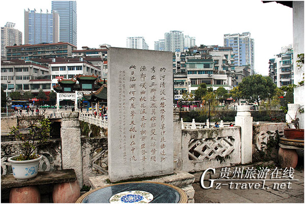 对侧立着另一块石碑,上刻甲秀楼的建造者——明万历年贵州巡抚江东之的诗: “明河清浅水悠悠,新筑沙堤接远洲。秀出三狮连凤翼,雄驱双骏踞鳌头。渔郎磯曲桃花浪,丞相祠前巨壑舟。此日临渊何所羡,擎天砥柱在中流。”