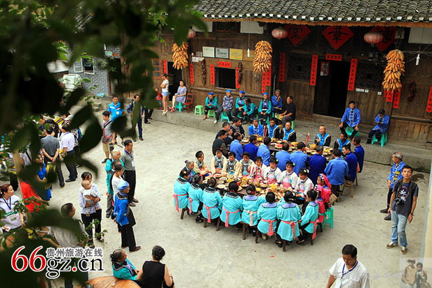 下行进入水东宋氏土司的官寨——马头村马头寨,展现千年水东美食文化的土司喜宴正在进行,充分展现了水东布依族坐夜筵的饮食特点、礼仪等,千年文化祭奠的气息扑面而来。村妇问了问席上老者,得知该形式至今仍是他们结婚喜宴所必办的,席间互相敬酒,吟诗作对,推杯换盏,最长可延续24个小时!