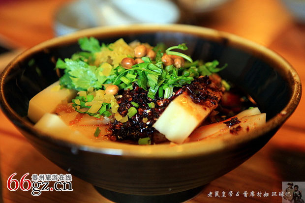 米豆腐是贵州特色小吃之一。其做法是先将大米淘洗浸泡后加水磨成米浆,然后加碱熬制,冷却,形成块状“豆腐”即成。食用时切成小片放入凉水中再捞出,盛入容器后,将切好的大头菜、盐菜、酥黄豆、酥花生、葱花等适合个人味口的不同佐料末与汤汁放于米豆腐上即可。