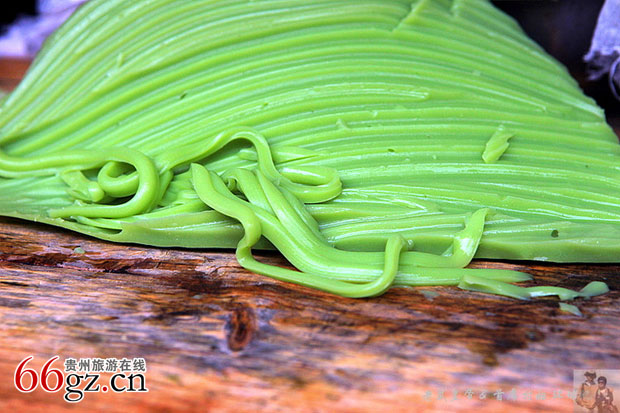 后来在青岩古镇吃到了绿色的米豆腐,据说是将某种野生蔬菜榨成汁后混入米浆中制作而成。