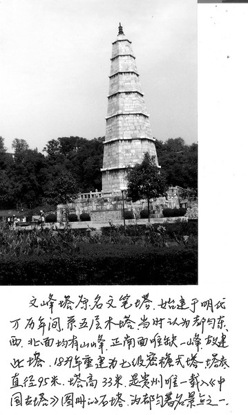 7月4日。根据前一天晚上对地图的“精心”研究和对贵州、广西地形的了解,计划这天可以骑出贵州省到广西南丹一带住下。哪知“计划不如变化”,可能是前两天100多公里的骑行,一早起来双腿的肌肉犹如被拉伤一般剧烈的疼痛,连迈步都非常困难,走起路来就像京剧舞台上迈着台步的小生。臀部一碰自行车坐垫也钻心的疼,根本就无法骑车。面对这种情况,自己不由得犹豫起来,但回头一想,难道就此打道回府、放弃这次“宏伟”的计划?不甘心啊!两年多的准备,几天来痛苦的挣扎,随着踏上回头路不就彻底付之东流了。最后还是决定调整行程:上午在都匀稍事休息,游览了当地的著名景点“文峰塔”,(如图1)于下午2点过钟出发前往第三站:独山。