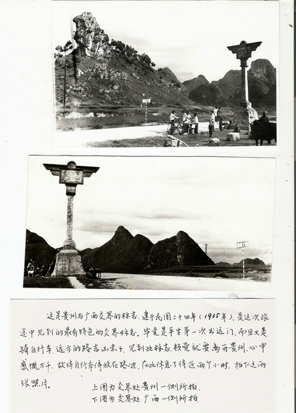 经过几公里谨慎、小心的砂石路行程,眼前赫然出现一块高大的石碑,路的对面还立有一块写有贵州、广西的牌子,难道这就是界碑?禁不住激动的心情一气冲了过去,围着石碑仔细地打量起来,啊!果然是界碑,而且是立于民国24年(现在看来应该算是文物了吧。),这就要离开贵州了?这一刻心里真像是打翻了五味瓶,离开贵阳几天来,白天都在跟盘山公路、当空的烈日、饥渴、疲劳、疼痛抗争,晚上研究地图、计划行程,然后迅速地进入梦乡,如此重复,从来没有时间想起过为自己的安危操心、惦记的父母,那时候不像现在这样通讯方便,没能及时地与家里联系,让他们随时了解我的情况,想到这就要离开父母,离开家乡了,面对前方吉凶未卜的行程,不由得生出些奇怪的念头:我还能回来吗?什么时候能回来呢?就这样在界碑下足足呆坐了近2个多小时,与其说是休息,到不如说是许多复杂心情的牵扯。所以人啊就是这样,当你盼望已久、苦苦争取的东西突然摆在你的面前,谁能保证你的心情都能像原来想象的那么愉快、满足?这两个多小时的停留,给了我思念亲人、思念家乡的机会,让我明白了许多,也许人只有停下来,才会认真地思考些问题吧。待思绪平静下来,在贵州、广西一侧分别拍了一张照片。
