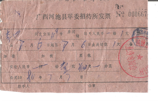 到河池市的路比山林里的宽多了,视野开阔,能见度也高。此时已接近十点,微风一吹,还有些凉意。紧张的心情终于得到了片刻的放松。就在这时,突然瞥见身后百米左右有个人骑着自行车正朝这边追赶,开始并没太在意,但他从我身边“超车”过去后,又逐渐放慢了速度,好像是在等我,如此重复了两三次,这下我的心一下子提到了嗓子眼儿,他这是要干什么?可能是由于害怕,趁他不注意时,伸手将放在包里防身用的刀拿在了右手上,然后有意往路中间骑行,把右侧的路让给他,同时用尽全身的力气,飞快地蹬着自行车,想迅速摆脱目前的“险境”。哪知道他丝毫没有停止追逐的打算,也加紧往前冲,一副不追上我决不罢休的架势,这时我可真的害怕了,更加拼命地往前骑行。不知不觉中在他将要追赶上我时,我们都已接近坡顶。可能是双方的体力差不多已消耗殆尽,不得已我们一前一后下了自行车,喘着粗气推着车步行,最后我们并肩走着,我用余光瞟了他一眼,没等我看清楚,耳边突然响起一句广西口音:“你踩得好快啊。”我这才慢慢地转过头去,仔细打量着他。他看上去是一个十多岁的当地小孩,他的自行车后面还驮着一个箱子,他不可能是劫匪吧?我壮着胆子问了一句:“你有什么事?”,没想到他的回答简直让我既吃惊、又好笑、又感到无地自容:“天太晚了,一个人在路上害怕,想跟你搭个伴。”“哦,原来是这样啊,我还以为。。。”,话到嘴边又咽了回去,真不好意思把刚才的想法告诉他。后来我们干脆站在路边,一边休息,一边攀谈起来。原来他是河池市郊一个农民家庭的孩子,家里由于生活困难,他不得已辍学出来做点小生意贴补家用。今天他是到河池去卖冰棍回来。交谈中他顺手从箱子里拿出一根冰棍递给我:“给,你吃吧,不要钱。”。还没等我推辞,他又说:“你好像不是广西人?”,看着他一脸孩子气,透着真诚,我也不好对他撒谎:“我是来旅游的,今晚想住在河池市区。”他立刻说:“河池我熟,我和你一起去打听,找个旅馆。”。就这样我们再次骑上自行车一起到河池市区,几经周折,找到市政府招待所。