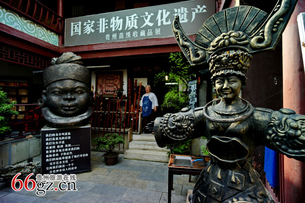 穿过几道牌坊,穿过吵杂的古街,穿过那一间接着一间的店铺,走进了一个幽静的巷子——状元街。状元府斜对面,门头上不很显眼的“始祖母”的门匾静静的挂在那里,门楼里,一尊仿铜的始祖母像在那里静静的立着,陪伴着这间“贵州民族服饰文化收藏馆”的主人艰难地度过了12个春秋寒暑,见证着主人12年的苦苦坚守......