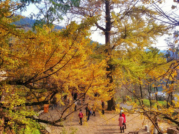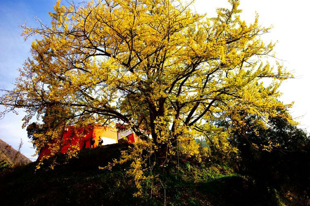 山寨依山傍水,金色的秋叶给它镀了一层梦幻的色彩。我们沿着村里的小路走下去。树根铺在路上,如同古稀老人手背上暴露的青筋,还有不少孩子就在树根上玩耍。树与树相依相偎,根与根紧紧相连。树下是房屋,房屋的墙脚边是树根,整个妥乐村就是托在树根上的村庄。据介绍,妥乐村有上千株古银杏树,最小的有300多岁,年长的500多岁。专家认为,如此集中连片且与村寨融为一体的古银杏群落,在世界上十分罕见。