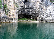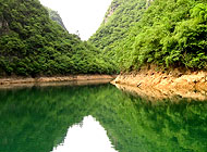 舞阳河畔的风光:前方的“鲤鱼背上”有个百岁村,村里的人靠山吃山,靠水吃水,以打鱼,种一点田为生,自给自足。吃的鱼是纯天然的舞阳河里的鱼;粮食蔬菜都是自己种的,不用农药;禽类的东东都是放养的,谈不上饲料,更谈不上催生素了。百岁老人的比例较高,据说是有名的“长寿村”。 湖水婉如碧玉般嫩绿清澈,湖面幽静清亮,空气清新沁脾。河边的小洞,里边还有个倒过的钟乳石。只有那个长寿村的人被政府允许在这条河里打鱼。深湖两岸山势峻峭雄伟,姿态各异,绿树幽篁点缀山崖。 | |