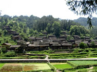第四站:郎德上寨之初进郎德 快要到中午的时候才到郎德上寨,恰巧一场民族表演结束,村民正在村中央的芦笙场向旅行团的人兜售银器刺绣苗装等纪念品。我随手拍了几张照片。 半小时后,旅行团的人全走了,只剩下我一个游客。还有两三个苗人看到我对她们的银器有点兴趣,争先恐后都哄到我面前,拿出她们的十八般"银器"等。闲着也是闲着,挑了两镯子,又借了她们的民族盛装拍了几张照,几经还价,总共付了20个钱,比起那些旅行团的人刚才的买价可划算多了。那些镯子虽然只含少量银,不过做工还算精细。应该都是银匠手工做的。心满意足地带在手上,然后穿上她们的盛装,摆起"扑死"臭美。