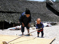 在苗家做客闲聊时,听说下午还有一个旅行团要来,会有民族表演。 每一场表演500元,包括迎客,拦寨酒,歌舞表演。每一个参与表演的人,按照所穿服装(盛装或是日常装)及表演项目(歌舞队,吹奏芦笙,拦寨酒,普通百姓)给予不同的工分。月末按工分分配收入。 像这样的季节,不包括黄金周,每天寨里有两三个团来观光,算起来,除去寨里抽去的小部分做公益基金外,每户村民的收入也颇丰了。 | |