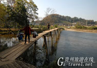 亮江流经这里,流速平缓,清澈见底,沿岸常绿乔木中间或夹杂几株枫香树,几场霜后,叶子有的泛黄,有的泛红,真是“霜叶红于二月花”,特别惹眼,再衬以晃悠悠的木桥和桥上的行人、清澈的水流、涉水过江的牛群、江边洗衣的妇女,俨然一幅上好的风景油画。