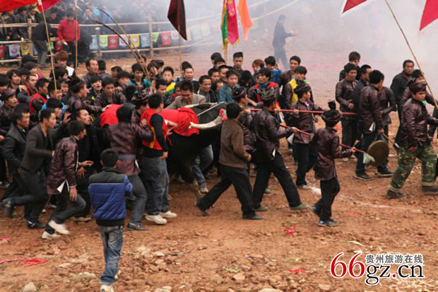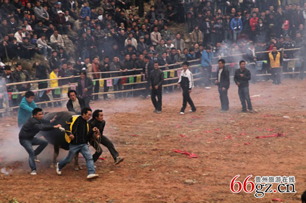 比赛采取的是作对厮杀,二十多个村的斗牛分成了十几个对子,(后来我才知道,侗族斗牛不像苗族斗牛一定要分出胜负,往往斗到正狠便有专门的人上去用粗绳绑住牛腿,两边拉开,此是后话。)