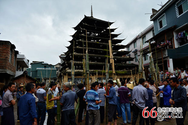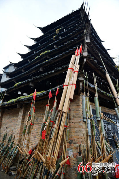 我们是一户石姓人家接待的。稍坐片刻,我们就向村子中央走去,自然,那里有一座鼓楼,从鼓楼的样式和瓦楞上长着的苔藓判断,这座鼓楼应该有些年头了,斑驳的檐口和墙体无不昭示着岁月的风霜雨雪的镌刻。鼓楼边上立满了各式的芦笙,场子上有约莫二三十个汉子在练习着芦笙的吹奏和队形。一个中年男子向我走来,轻声的邀请我到他家午餐,说到现在他家还没有拉到客人,并腼腆地给我说不要钱。我很快就明白了他的诚意,给他道谢并说我们有人家了。