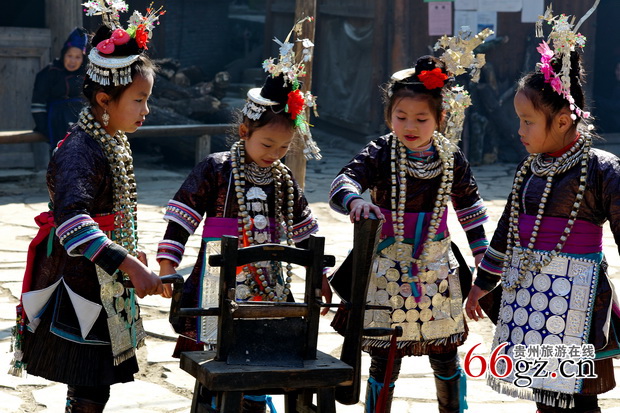 表演完童声侗族大歌,孩子们又接着为我们表演了压棉花、纺纱、织布等侗族纺织工艺的部分工序。那动作虽然稍显稚嫩,却也像模像样。侗族的传统纺织技艺就是这样一代一代传承下来的,没有儿时的稚嫩,哪有成人后的娴熟?我还知道,侗族女孩从四五岁时就开始跟着母亲学做女红,再大一点,就要跟着母亲学习纺纱织布、挑花刺绣,与学习为人处世、学习孝道、学习文化一样,是女孩一生中的几个必修课。