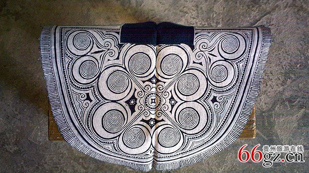 这就是丹寨蜡染中最具有代表性的纹样——“涡妥”,像水纹,又似植物卷曲的样子。这样的图样一般出现在丹寨妇女传统服饰上。