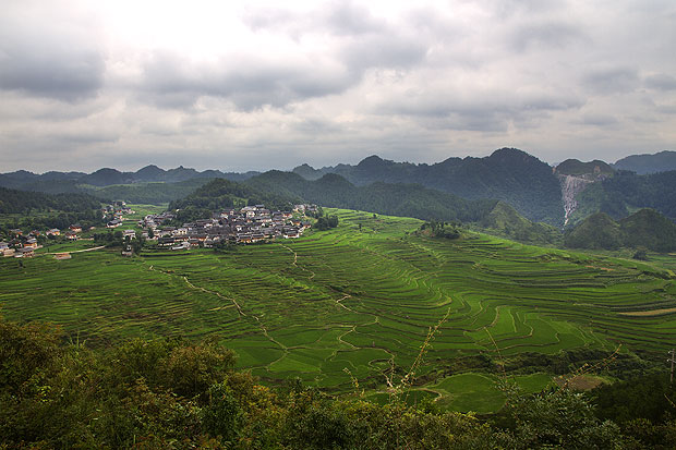 绿油油的梯田如绿色的海浪静静环绕着山间的高要村寨。