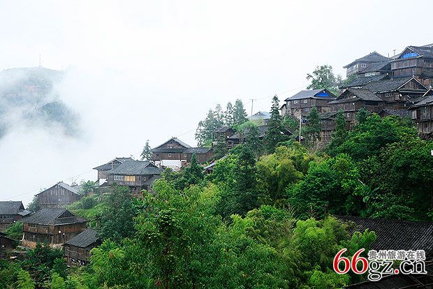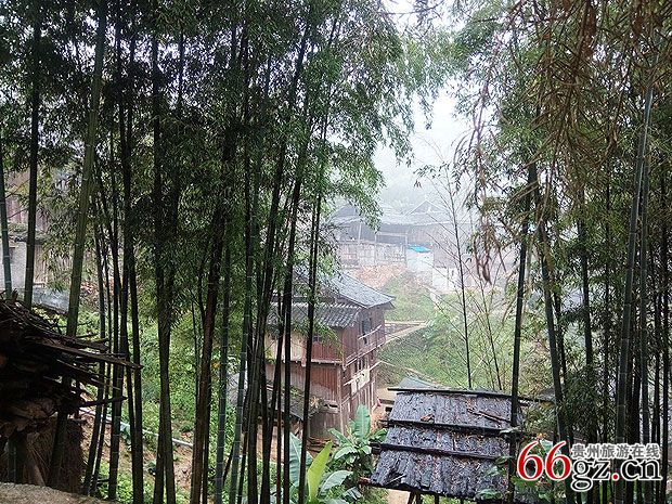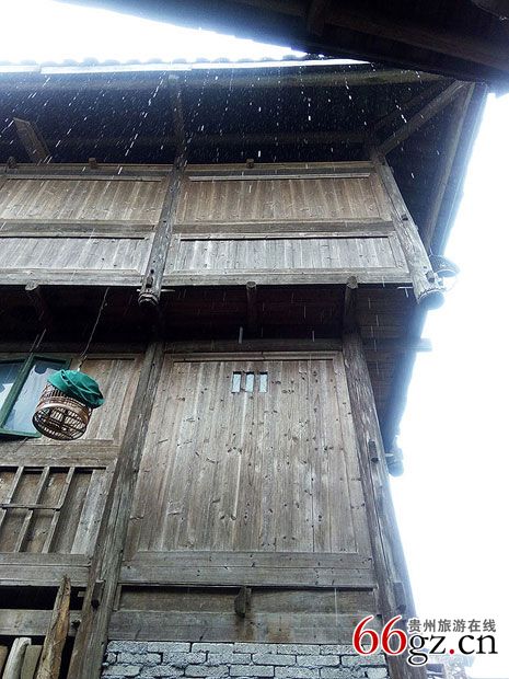 苗寨四周植树和竹子,就地取材的吊脚楼建三层,一楼三面光只养鸡鸭猪牛,二三楼供人起居。房顶盖青瓦,据传以前用宽大树皮平铺当瓦,现看到了一些小配房仍用着树皮盖顶。广植的竹子可编农具和家具,充分利用着大自然资源。楼阁上喜欢挂一鸟笼,内养山上抓来的画眉,说是从小鸟崽就开始养起,农闲时可以逗鸟和斗鸟取乐。