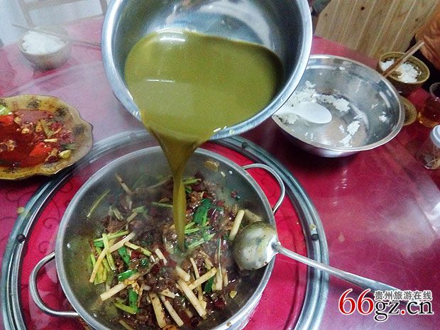 在黔东南的从江县城,见到好几家的酸汤牛肉店招牌上标有“牛瘪”,一问才知它是当地的一种特色美食名称,取自牛胃中的未完全消化草汁烹制而成。这种美食以前了解过,只是心存疑虑如何能吃,今日撞上必得品尝一下。
