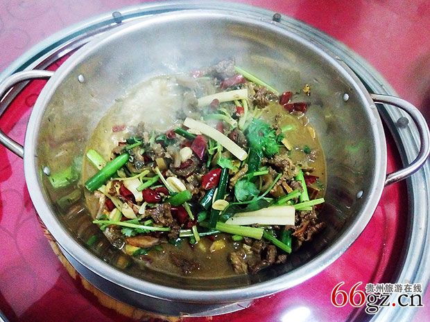 来上一盘牛肉干锅,内有片牛肉、带皮牛脚肉、牛肚、生萝卜条、花椒、红辣椒、大蒜段、芹菜梗、折耳根和些不知名香料。浇入添佐料加工煮过的牛瘪汤,色绿并有青草香,吃到口里似薄荷味不恶心。后再加豆皮、豆芽、洋芋,依然吃得津津有味,当初的顾忌和疑虑一扫而光。