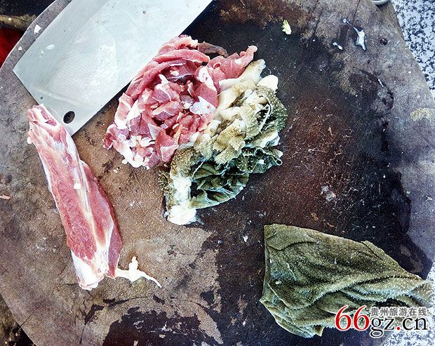 隔日到了从江县停洞镇,街上又见到许多牛瘪店,在中午用餐的饭店里也有牛瘪可吃。老板说停洞牛瘪比从江县城的更正宗更好吃,县城的还是从停洞专门送过去的,那就来份尝尝吧。